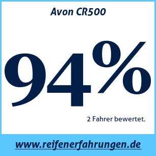 Avon CR500 AvonDer Avon CR500 Reifen wurde von 2 Benutzern bewertet, die ihm eine Gesamtbewertung von 94% gaben. Dieser Reifen wird am häufigsten in den Größen 225 45 R17, 205 40 R15 getestet.