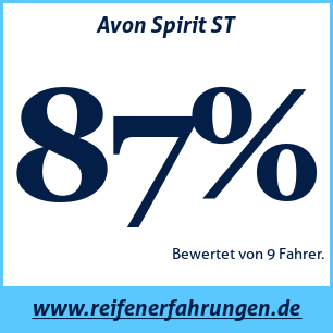 Avon Spirit ST AvonDer Avon Spirit ST Reifen wurde von 9 Benutzern bewertet, die ihm eine Gesamtbewertung von 87% gaben. Dieser Reifen wird am häufigsten in den Größen 180 55 R17, 190 55 R17, 120 70 R17 getestet.