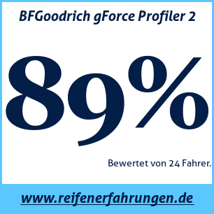 BFGoodrich gForce Profiler 2 BFGoodrichDer BFGoodrich gForce Profiler 2 Reifen wurde von 24 Benutzern bewertet, die ihm eine Gesamtbewertung von 89% gaben. Dieser Reifen wird am häufigsten in den Größen 225 45 R17, 225 40 R18, 195 55 R15 getestet.