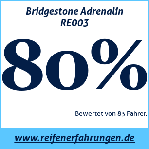 Der Reifen Bridgestone Adrenalin RE003 wurde von 83 der Nutzer zu allen genannten Aspekten bewertet, von denen 1 auch eine Textbewertung abgegeben haben.