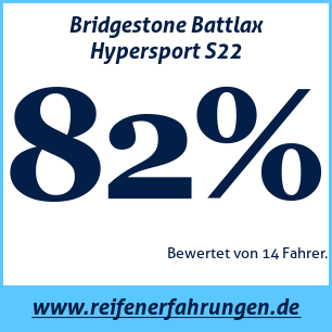 Bridgestone Battlax Hypersport S22 BridgestoneDer Bridgestone Battlax Hypersport S22 Reifen wurde von 14 Benutzern bewertet, die ihm eine Gesamtbewertung von 82% gaben. Dieser Reifen wird am häufigsten in den Größen 190 55 R17, 180 55 R17, 225 45 R17 getestet.