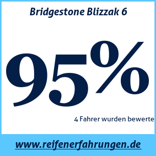 Der Bridgestone Blizzak 6 Reifen wurde von 4 Benutzern bewertet, die ihm eine Gesamtbewertung von 95% gaben. Dieser Reifen wird am häufigsten in den Größen 215 55 R17, 205 55 R16, 255 35 R19 getestet.