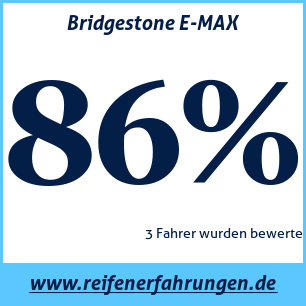 Bridgestone E-MAX BridgestoneDer Bridgestone E-MAX Reifen wurde von 3 Benutzern bewertet, die ihm eine Gesamtbewertung von 86% gaben. Dieser Reifen wird am häufigsten in den Größen 180 55 R17, 170 60 R17, 180 70 R16 getestet.
