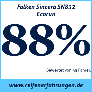Der Falken Sincera SN832 Ecorun Reifen wurde von 45 Benutzern bewertet, die ihm eine Gesamtbewertung von 88% gaben. Dieser Reifen wird am häufigsten in den Größen 165 70 R13, 225 45 R17, 175 60 R14 getestet.