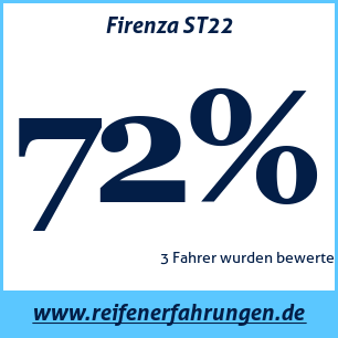 Firenza ST22 FirenzaDer Firenza ST22 Reifen wurde von 3 Benutzern bewertet, die ihm eine Gesamtbewertung von 72% gaben. Dieser Reifen wird am häufigsten in den Größen 195 55 R15, 225 50 R17, 245 35 R19 getestet.