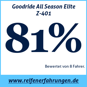 Goodride All Season Elite Z-401 GoodrideDer Goodride All Season Elite Z-401 Reifen wurde von 8 Benutzern bewertet, die ihm eine Gesamtbewertung von 81% gaben. Dieser Reifen wird am häufigsten in den Größen 225 55 R16, 215 45 R17, 205 55 R16 getestet.