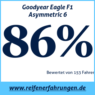 Der Goodyear Eagle F1 Asymmetric 6 Reifen wurde von 153 Benutzern bewertet, die ihm eine Gesamtbewertung von 86% gaben. Dieser Reifen wird am häufigsten in den Größen 225 45 R17, 225 40 R18, 235 45 R17 getestet.