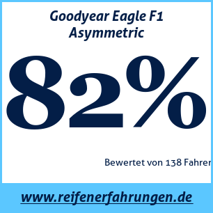 Goodyear Eagle F1 Asymmetric GoodyearDer Goodyear Eagle F1 Asymmetric Reifen wurde von 138 Benutzern bewertet, die ihm eine Gesamtbewertung von 82% gaben. Dieser Reifen wird am häufigsten in den Größen 225 45 R17, 225 40 R18, 235 40 R18 getestet.