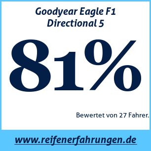 Goodyear Eagle F1 Directional 5 GoodyearDer Goodyear Eagle F1 Directional 5 Reifen wurde von 27 Benutzern bewertet, die ihm eine Gesamtbewertung von 81% gaben. Dieser Reifen wird am häufigsten in den Größen 225 45 R17, 215 45 R17, 195 55 R15 getestet.