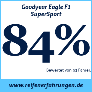 Der Goodyear Eagle F1 SuperSport Reifen wurde von 53 Benutzern bewertet, die ihm eine Gesamtbewertung von 84% gaben. Dieser Reifen wird am häufigsten in den Größen 225 40 R18, 235 40 R18, 235 35 R19 getestet.