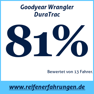 Goodyear Wrangler DuraTrac GoodyearDer Goodyear Wrangler DuraTrac Reifen wurde von 13 Benutzern bewertet, die ihm eine Gesamtbewertung von 81% gaben. Dieser Reifen wird am häufigsten in den Größen 265 75 R16, 255 55 R19, 235 75 R15 getestet.
