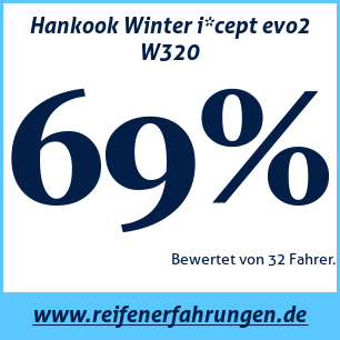 Der Hankook Winter i*cept evo2 W320 Reifen wurde von 32 Benutzern bewertet, die ihm eine Gesamtbewertung von 69% gaben. Dieser Reifen wird am häufigsten in den Größen 225 45 R17, 205 55 R16, 195 65 R15 getestet.