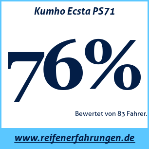Der Kumho Ecsta PS71 Reifen wurde von 83 Benutzern bewertet, die ihm eine Gesamtbewertung von 76% gaben. Dieser Reifen wird am häufigsten in den Größen 225 45 R17, 215 45 R17, 245 45 R18 getestet.