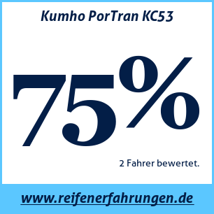 Der Kumho PorTran KC53 Reifen wurde von 2 Benutzern bewertet, die ihm eine Gesamtbewertung von 75% gaben. Dieser Reifen wird am häufigsten in den Größen 225 45 R17, 185 80 R14 getestet.