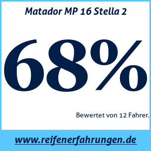 Matador MP 16 Stella 2 MatadorDer Matador MP 16 Stella 2 Reifen wurde von 12 Benutzern bewertet, die ihm eine Gesamtbewertung von 68% gaben. Dieser Reifen wird am häufigsten in den Größen 175 65 R14, 185 60 R14, 225 45 R17 getestet.