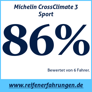 Michelin CrossClimate 3 Sport MichelinDer Michelin CrossClimate 3 Sport Reifen wurde von 6 Benutzern bewertet, die ihm eine Gesamtbewertung von 86% gaben. Dieser Reifen wird am häufigsten in den Größen 245 40 R19, 245 45 R19, 225 40 R18 getestet.