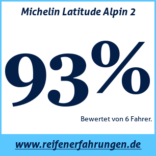 Der Michelin Latitude Alpin 2 Reifen wurde von 6 Benutzern bewertet, die ihm eine Gesamtbewertung von 93% gaben. Dieser Reifen wird am häufigsten in den Größen 225 45 R17, 255 55 R19, 185 65 R15 getestet.