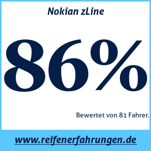 Der Nokian zLine Reifen wurde von 81 Benutzern bewertet, die ihm eine Gesamtbewertung von 86% gaben. Dieser Reifen wird am häufigsten in den Größen 225 45 R17, 225 40 R18, 235 35 R19 getestet.