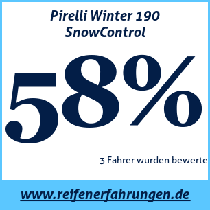 Pirelli Winter 190 SnowControl PirelliDer Pirelli Winter 190 SnowControl Reifen wurde von 3 Benutzern bewertet, die ihm eine Gesamtbewertung von 58% gaben. Dieser Reifen wird am häufigsten in den Größen 225 45 R17, 195 65 R15, 195 65 R16 getestet.