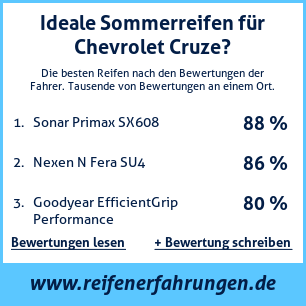 Tests, Bewertungen und Meinungen zu Sommer Reifen für Chevrolet Cruze. Die von unseren Nutzern am häufigsten verwendeten Reifengrößen für dieses Fahrzeug sind 205 60 R16, 225 50 R17, 225 45 R17, 205 50 R17, 195 55 R16. Mit dieser Übersicht an Bewertungen zu Sommer Reifen für Chevrolet Cruze von anderen Autofahrern, versuchen wir Ihnen möglichst objektive Informationen zur Verfügung zu stellen, damit Sie Sommer Reifen wählen können. Je mehr Bewertungen, desto genauer und glaubwürdiger ist die Meinung. Wir legen großen Wert darauf, die Bewertungen so objektiv wie möglich zu gestalten.