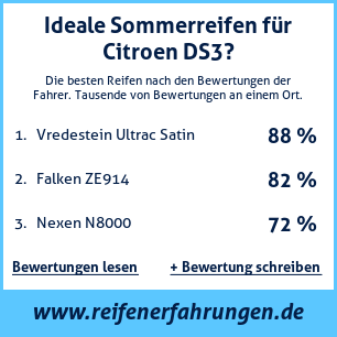 Wenn Sie eine eigene Website zum Thema Auto haben, oder wenn Sie ein Reifenlieferant sind, können Sie unsere Plakette zur Bewertung von Autoreifen auf Ihrer Website Citroen DS3 platzieren: Test der Reifen auf Citroen DS3 [png]