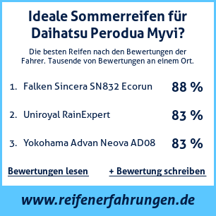 Tests, Bewertungen und Meinungen zu Sommer Reifen für Daihatsu Perodua Myvi. Die von unseren Nutzern am häufigsten verwendeten Reifengrößen für dieses Fahrzeug sind 225 45 R17, 175 65 R14, 195 55 R15, 205 45 R16, 185 60 R14. Mit dieser Übersicht an Bewertungen zu Sommer Reifen für Daihatsu Perodua Myvi von anderen Autofahrern, versuchen wir Ihnen möglichst objektive Informationen zur Verfügung zu stellen, damit Sie Sommer Reifen wählen können. Je mehr Bewertungen, desto genauer und glaubwürdiger ist die Meinung. Wir legen großen Wert darauf, die Bewertungen so objektiv wie möglich zu gestalten.