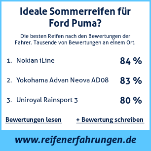 Tests, Bewertungen und Meinungen zu Sommer Reifen für Ford Puma. Die von unseren Nutzern am häufigsten verwendeten Reifengrößen für dieses Fahrzeug sind 195 50 R15, 225 45 R17, 205 40 R17, 175 70 R13, 225 45 R18. Mit dieser Übersicht an Bewertungen zu Sommer Reifen für Ford Puma von anderen Autofahrern, versuchen wir Ihnen möglichst objektive Informationen zur Verfügung zu stellen, damit Sie Sommer Reifen wählen können. Je mehr Bewertungen, desto genauer und glaubwürdiger ist die Meinung. Wir legen großen Wert darauf, die Bewertungen so objektiv wie möglich zu gestalten.