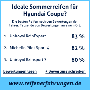Tests, Bewertungen und Meinungen zu Sommer Reifen für Hyundai Coupe. Die von unseren Nutzern am häufigsten verwendeten Reifengrößen für dieses Fahrzeug sind 225 45 R17, 215 45 R17, 225 35 R18, 205 55 R16, 245 55 R17. Mit dieser Übersicht an Bewertungen zu Sommer Reifen für Hyundai Coupe von anderen Autofahrern, versuchen wir Ihnen möglichst objektive Informationen zur Verfügung zu stellen, damit Sie Sommer Reifen wählen können. Je mehr Bewertungen, desto genauer und glaubwürdiger ist die Meinung. Wir legen großen Wert darauf, die Bewertungen so objektiv wie möglich zu gestalten.