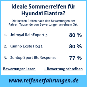 Tests, Bewertungen und Meinungen zu Sommer Reifen für Hyundai Elantra. Die von unseren Nutzern am häufigsten verwendeten Reifengrößen für dieses Fahrzeug sind 225 45 R17, 195 65 R15, 215 45 R17, 205 55 R16, 225 40 R18. Mit dieser Übersicht an Bewertungen zu Sommer Reifen für Hyundai Elantra von anderen Autofahrern, versuchen wir Ihnen möglichst objektive Informationen zur Verfügung zu stellen, damit Sie Sommer Reifen wählen können. Je mehr Bewertungen, desto genauer und glaubwürdiger ist die Meinung. Wir legen großen Wert darauf, die Bewertungen so objektiv wie möglich zu gestalten.