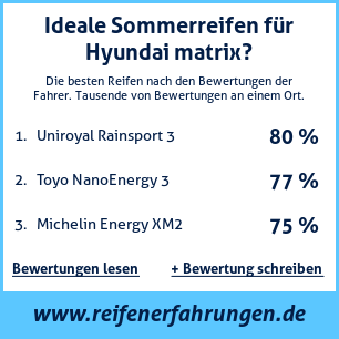 Tests, Bewertungen und Meinungen zu Sommer Reifen für Hyundai matrix. Die von unseren Nutzern am häufigsten verwendeten Reifengrößen für dieses Fahrzeug sind 185 65 R14, 225 45 R17, 195 60 R15, 185 60 R14. Mit dieser Übersicht an Bewertungen zu Sommer Reifen für Hyundai matrix von anderen Autofahrern, versuchen wir Ihnen möglichst objektive Informationen zur Verfügung zu stellen, damit Sie Sommer Reifen wählen können. Je mehr Bewertungen, desto genauer und glaubwürdiger ist die Meinung. Wir legen großen Wert darauf, die Bewertungen so objektiv wie möglich zu gestalten.