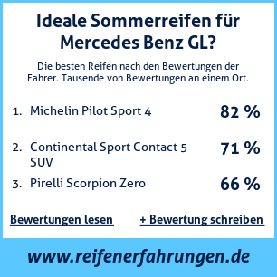 Tests, Bewertungen und Meinungen zu Sommer Reifen für Mercedes Benz GL. Die von unseren Nutzern am häufigsten verwendeten Reifengrößen für dieses Fahrzeug sind 265 55 R19, 225 65 R17, 295 40 R21, 275 50 R20. Mit dieser Übersicht an Bewertungen zu Sommer Reifen für Mercedes Benz GL von anderen Autofahrern, versuchen wir Ihnen möglichst objektive Informationen zur Verfügung zu stellen, damit Sie Sommer Reifen wählen können. Je mehr Bewertungen, desto genauer und glaubwürdiger ist die Meinung. Wir legen großen Wert darauf, die Bewertungen so objektiv wie möglich zu gestalten.