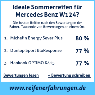 Tests, Bewertungen und Meinungen zu Sommer Reifen für Mercedes Benz W124. Die von unseren Nutzern am häufigsten verwendeten Reifengrößen für dieses Fahrzeug sind 195 65 R15, 225 45 R17, 205 60 R15. Mit dieser Übersicht an Bewertungen zu Sommer Reifen für Mercedes Benz W124 von anderen Autofahrern, versuchen wir Ihnen möglichst objektive Informationen zur Verfügung zu stellen, damit Sie Sommer Reifen wählen können. Je mehr Bewertungen, desto genauer und glaubwürdiger ist die Meinung. Wir legen großen Wert darauf, die Bewertungen so objektiv wie möglich zu gestalten.