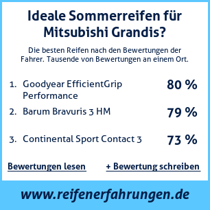 Tests, Bewertungen und Meinungen zu Sommer Reifen für Mitsubishi Grandis. Die von unseren Nutzern am häufigsten verwendeten Reifengrößen für dieses Fahrzeug sind 225 45 R17, 215 55 R17, 215 45 R17, 195 60 R15, 235 45 R18. Mit dieser Übersicht an Bewertungen zu Sommer Reifen für Mitsubishi Grandis von anderen Autofahrern, versuchen wir Ihnen möglichst objektive Informationen zur Verfügung zu stellen, damit Sie Sommer Reifen wählen können. Je mehr Bewertungen, desto genauer und glaubwürdiger ist die Meinung. Wir legen großen Wert darauf, die Bewertungen so objektiv wie möglich zu gestalten.