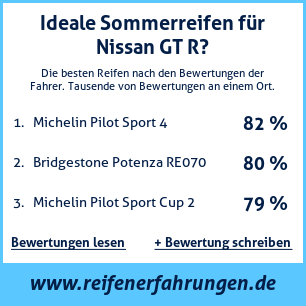 Wenn Sie eine eigene Website zum Thema Auto haben, oder wenn Sie ein Reifenlieferant sind, können Sie unsere Plakette zur Bewertung von Autoreifen auf Ihrer Website Nissan GT R platzieren: Test der Reifen auf Nissan GT R [png]