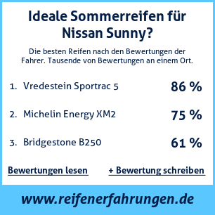 Wenn Sie eine eigene Website zum Thema Auto haben, oder wenn Sie ein Reifenlieferant sind, können Sie unsere Plakette zur Bewertung von Autoreifen auf Ihrer Website Nissan Sunny platzieren: Test der Reifen auf Nissan Sunny [png] ![]()