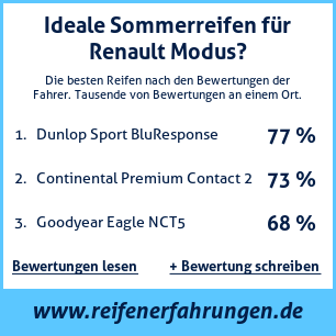 Wenn Sie eine eigene Website zum Thema Auto haben, oder wenn Sie ein Reifenlieferant sind, können Sie unsere Plakette zur Bewertung von Autoreifen auf Ihrer Website Renault Modus platzieren: Test der Reifen auf Renault Modus [png]