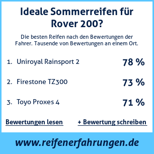 Tests, Bewertungen und Meinungen zu Sommer Reifen für Rover 200. Die von unseren Nutzern am häufigsten verwendeten Reifengrößen für dieses Fahrzeug sind 195 55 R15, 175 65 R14, 195 50 R15, 185 55 R15, 205 50 R15. Mit dieser Übersicht an Bewertungen zu Sommer Reifen für Rover 200 von anderen Autofahrern, versuchen wir Ihnen möglichst objektive Informationen zur Verfügung zu stellen, damit Sie Sommer Reifen wählen können. Je mehr Bewertungen, desto genauer und glaubwürdiger ist die Meinung. Wir legen großen Wert darauf, die Bewertungen so objektiv wie möglich zu gestalten.