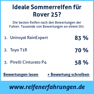 Tests, Bewertungen und Meinungen zu Sommer Reifen für Rover 25. Die von unseren Nutzern am häufigsten verwendeten Reifengrößen für dieses Fahrzeug sind 185 55 R15, 175 65 R14, 185 65 R14, 195 60 R15, 225 45 R17. Mit dieser Übersicht an Bewertungen zu Sommer Reifen für Rover 25 von anderen Autofahrern, versuchen wir Ihnen möglichst objektive Informationen zur Verfügung zu stellen, damit Sie Sommer Reifen wählen können. Je mehr Bewertungen, desto genauer und glaubwürdiger ist die Meinung. Wir legen großen Wert darauf, die Bewertungen so objektiv wie möglich zu gestalten.