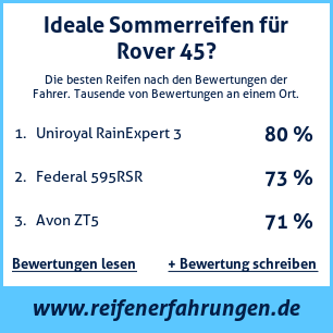 Tests, Bewertungen und Meinungen zu Sommer Reifen für Rover 45. Die von unseren Nutzern am häufigsten verwendeten Reifengrößen für dieses Fahrzeug sind 185 65 R14, 225 45 R17, 205 50 R15, 205 40 R17, 195 60 R15. Mit dieser Übersicht an Bewertungen zu Sommer Reifen für Rover 45 von anderen Autofahrern, versuchen wir Ihnen möglichst objektive Informationen zur Verfügung zu stellen, damit Sie Sommer Reifen wählen können. Je mehr Bewertungen, desto genauer und glaubwürdiger ist die Meinung. Wir legen großen Wert darauf, die Bewertungen so objektiv wie möglich zu gestalten.