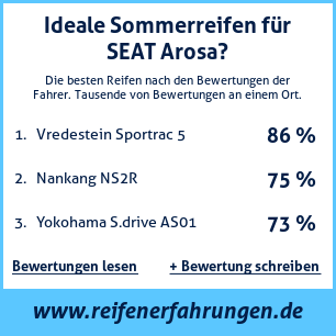 Tests, Bewertungen und Meinungen zu Sommer Reifen für SEAT Arosa. Die von unseren Nutzern am häufigsten verwendeten Reifengrößen für dieses Fahrzeug sind 195 45 R15, 185 55 R14, 195 40 R16, 225 45 R17, 195 50 R15. Mit dieser Übersicht an Bewertungen zu Sommer Reifen für SEAT Arosa von anderen Autofahrern, versuchen wir Ihnen möglichst objektive Informationen zur Verfügung zu stellen, damit Sie Sommer Reifen wählen können. Je mehr Bewertungen, desto genauer und glaubwürdiger ist die Meinung. Wir legen großen Wert darauf, die Bewertungen so objektiv wie möglich zu gestalten.