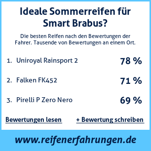 Tests, Bewertungen und Meinungen zu Sommer Reifen für Smart Brabus. Die von unseren Nutzern am häufigsten verwendeten Reifengrößen für dieses Fahrzeug sind 225 35 R18, 225 35 R17, 205 40 R17, 195 45 R15, 225 45 R17. Mit dieser Übersicht an Bewertungen zu Sommer Reifen für Smart Brabus von anderen Autofahrern, versuchen wir Ihnen möglichst objektive Informationen zur Verfügung zu stellen, damit Sie Sommer Reifen wählen können. Je mehr Bewertungen, desto genauer und glaubwürdiger ist die Meinung. Wir legen großen Wert darauf, die Bewertungen so objektiv wie möglich zu gestalten.