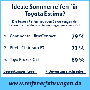 Tests, Bewertungen und Meinungen zu Sommer Reifen für Toyota Estima. Die von unseren Nutzern am häufigsten verwendeten Reifengrößen für dieses Fahrzeug sind 225 45 R18, 225 45 R17, 235 45 R18, 215 55 R17, 185 80 R14. Mit dieser Übersicht an Bewertungen zu Sommer Reifen für Toyota Estima von anderen Autofahrern, versuchen wir Ihnen möglichst objektive Informationen zur Verfügung zu stellen, damit Sie Sommer Reifen wählen können. Je mehr Bewertungen, desto genauer und glaubwürdiger ist die Meinung. Wir legen großen Wert darauf, die Bewertungen so objektiv wie möglich zu gestalten.