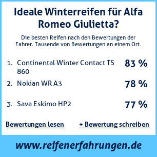 Tests, Bewertungen und Meinungen zu Winter Reifen für Alfa Romeo Giulietta. Die von unseren Nutzern am häufigsten verwendeten Reifengrößen für dieses Fahrzeug sind 225 45 R17, 225 40 R18, 205 55 R16, 235 40 R18, 235 35 R19. Mit dieser Übersicht an Bewertungen zu Winter Reifen für Alfa Romeo Giulietta von anderen Autofahrern, versuchen wir Ihnen möglichst objektive Informationen zur Verfügung zu stellen, damit Sie Winter Reifen wählen können. Je mehr Bewertungen, desto genauer und glaubwürdiger ist die Meinung. Wir legen großen Wert darauf, die Bewertungen so objektiv wie möglich zu gestalten.