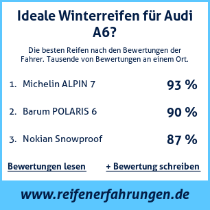 Tests, Bewertungen und Meinungen zu Winter Reifen für Audi A6. Die von unseren Nutzern am häufigsten verwendeten Reifengrößen für dieses Fahrzeug sind 225 45 R17, 245 40 R18, 245 45 R18, 255 35 R19, 225 50 R17. Mit dieser Übersicht an Bewertungen zu Winter Reifen für Audi A6 von anderen Autofahrern, versuchen wir Ihnen möglichst objektive Informationen zur Verfügung zu stellen, damit Sie Winter Reifen wählen können. Je mehr Bewertungen, desto genauer und glaubwürdiger ist die Meinung. Wir legen großen Wert darauf, die Bewertungen so objektiv wie möglich zu gestalten.