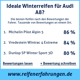 Tests, Bewertungen und Meinungen zu Winter Reifen für Audi A8. Die von unseren Nutzern am häufigsten verwendeten Reifengrößen für dieses Fahrzeug sind 255 40 R19, 225 45 R17, 235 55 R17, 265 40 R20, 245 45 R18. Mit dieser Übersicht an Bewertungen zu Winter Reifen für Audi A8 von anderen Autofahrern, versuchen wir Ihnen möglichst objektive Informationen zur Verfügung zu stellen, damit Sie Winter Reifen wählen können. Je mehr Bewertungen, desto genauer und glaubwürdiger ist die Meinung. Wir legen großen Wert darauf, die Bewertungen so objektiv wie möglich zu gestalten.