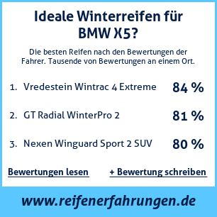 Tests, Bewertungen und Meinungen zu Winter Reifen für BMW X5. Die von unseren Nutzern am häufigsten verwendeten Reifengrößen für dieses Fahrzeug sind 315 35 R20, 225 45 R17, 275 40 R20, 285 45 R19, 255 55 R18. Mit dieser Übersicht an Bewertungen zu Winter Reifen für BMW X5 von anderen Autofahrern, versuchen wir Ihnen möglichst objektive Informationen zur Verfügung zu stellen, damit Sie Winter Reifen wählen können. Je mehr Bewertungen, desto genauer und glaubwürdiger ist die Meinung. Wir legen großen Wert darauf, die Bewertungen so objektiv wie möglich zu gestalten.