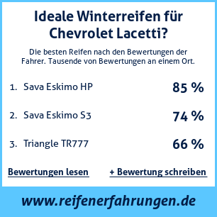 Tests, Bewertungen und Meinungen zu Winter Reifen für Chevrolet Lacetti. Die von unseren Nutzern am häufigsten verwendeten Reifengrößen für dieses Fahrzeug sind 195 55 R15, 225 45 R17, 195 60 R15, 185 60 R15. Mit dieser Übersicht an Bewertungen zu Winter Reifen für Chevrolet Lacetti von anderen Autofahrern, versuchen wir Ihnen möglichst objektive Informationen zur Verfügung zu stellen, damit Sie Winter Reifen wählen können. Je mehr Bewertungen, desto genauer und glaubwürdiger ist die Meinung. Wir legen großen Wert darauf, die Bewertungen so objektiv wie möglich zu gestalten.