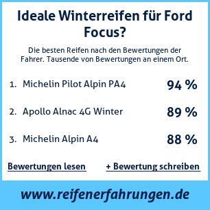 Tests, Bewertungen und Meinungen zu Winter Reifen für Ford Focus. Die von unseren Nutzern am häufigsten verwendeten Reifengrößen für dieses Fahrzeug sind 205 55 R16, 225 45 R17, 225 40 R18, 195 60 R15, 215 50 R17. Mit dieser Übersicht an Bewertungen zu Winter Reifen für Ford Focus von anderen Autofahrern, versuchen wir Ihnen möglichst objektive Informationen zur Verfügung zu stellen, damit Sie Winter Reifen wählen können. Je mehr Bewertungen, desto genauer und glaubwürdiger ist die Meinung. Wir legen großen Wert darauf, die Bewertungen so objektiv wie möglich zu gestalten.