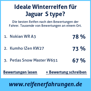 Tests, Bewertungen und Meinungen zu Winter Reifen für Jaguar S type. Die von unseren Nutzern am häufigsten verwendeten Reifengrößen für dieses Fahrzeug sind 225 45 R17, 245 40 R18, 245 45 R17, 225 55 R16, 275 35 R18. Mit dieser Übersicht an Bewertungen zu Winter Reifen für Jaguar S type von anderen Autofahrern, versuchen wir Ihnen möglichst objektive Informationen zur Verfügung zu stellen, damit Sie Winter Reifen wählen können. Je mehr Bewertungen, desto genauer und glaubwürdiger ist die Meinung. Wir legen großen Wert darauf, die Bewertungen so objektiv wie möglich zu gestalten.