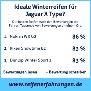 Tests, Bewertungen und Meinungen zu Winter Reifen für Jaguar X Type. Die von unseren Nutzern am häufigsten verwendeten Reifengrößen für dieses Fahrzeug sind 225 45 R17, 205 55 R16, 225 40 R18, 225 45 R19, 205 50 R16. Mit dieser Übersicht an Bewertungen zu Winter Reifen für Jaguar X Type von anderen Autofahrern, versuchen wir Ihnen möglichst objektive Informationen zur Verfügung zu stellen, damit Sie Winter Reifen wählen können. Je mehr Bewertungen, desto genauer und glaubwürdiger ist die Meinung. Wir legen großen Wert darauf, die Bewertungen so objektiv wie möglich zu gestalten.